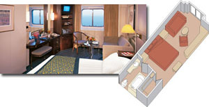 2 lower beds convertible to 1 king-size bed, walk-in closet, bath with tub and shower, sitting area, private verandah, refrigerator, floor-to-ceiling windows. *228-238 sq. ft. with verandah.